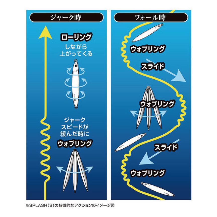 このジグは、ジャークを入れることでショートスライドを繰り返し、一瞬止まった時にウォブリング。