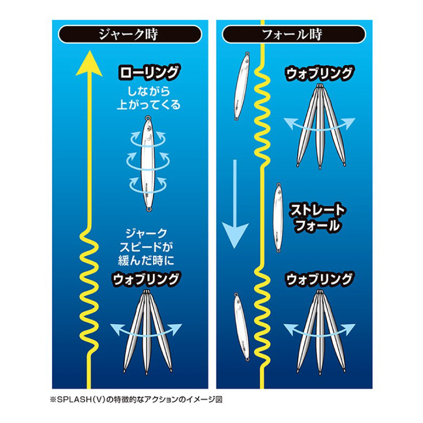 このジグは、ジャークを入れることでショートスライドを繰り返し、一瞬止まった時にウォブリング。